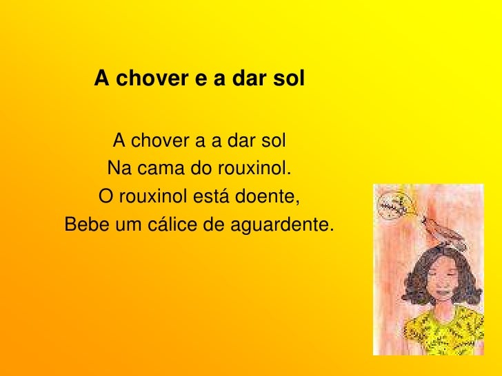 5. 5. A chover e a dar sol<br />A chover a a dar sol<br />Na cama do rouxinol.<br />O rouxinol está doente,<br />Bebe um cálice de aguardente.<br />