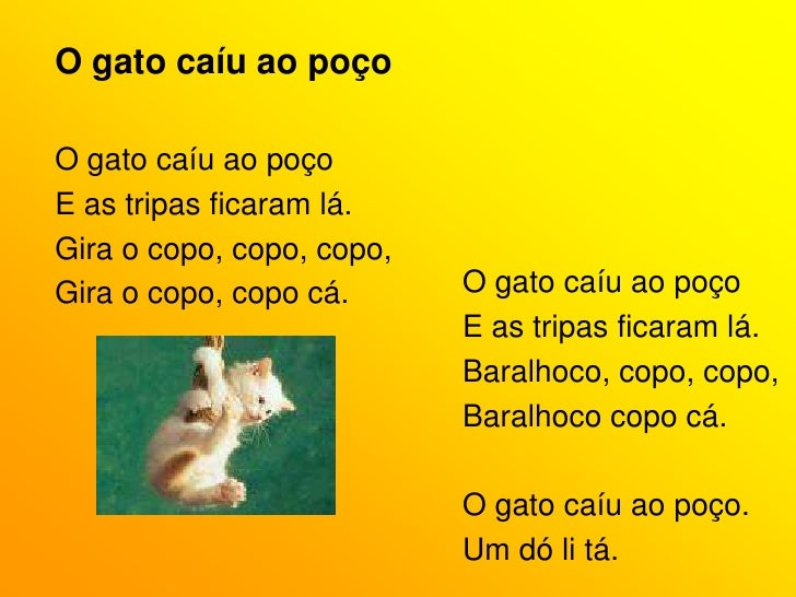 72. 72. O gato caíu ao poço<br />O gato caíu ao poço<br />E as tripas ficaram lá.<br />Gira o copo, copo, copo,<br />Gira o copo, copo cá.<br />O gato caíu ao poço<br />E as tripas ficaram lá.<br />Baralhoco, copo, copo, <br />Baralhoco copo cá.<br />O gato caíu ao poço.<br />Um dó li tá.<br />