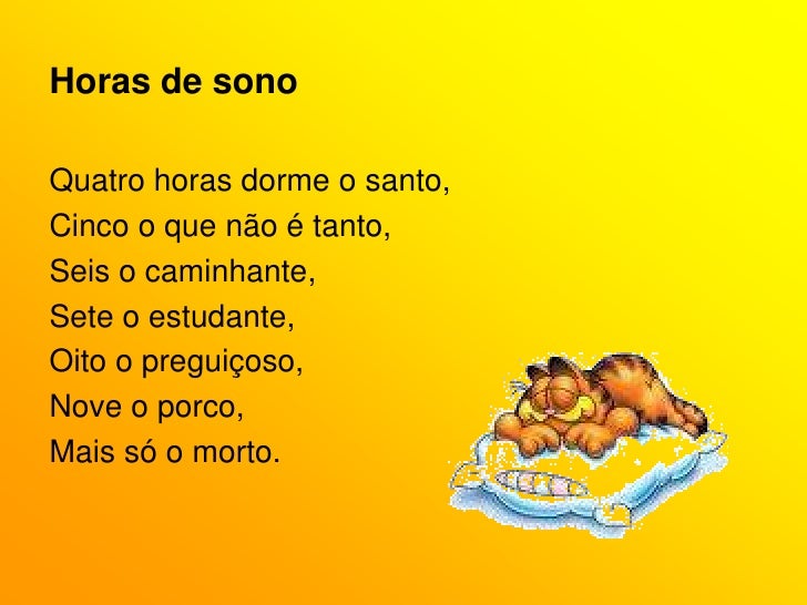 73. 73. Horas de sono<br />Quatro horas dorme o santo,<br />Cinco o que não é tanto,<br />Seis o caminhante,<br />Sete o estudante,<br />Oito o preguiçoso,<br />Nove o porco,<br />Mais só o morto.<br />