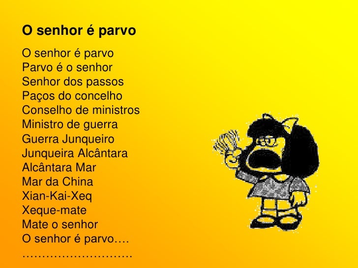 75. 75. O senhor é parvo<br />O senhor é parvo<br />Parvo é o senhor<br />Senhor dos passos<br />Paços do concelho<br />Conselho de ministros<br />Ministro de guerra<br />Guerra Junqueiro<br />Junqueira Alcântara<br />Alcântara Mar<br />Mar da China<br />Xian-Kai-Xeq<br />Xeque-mate<br />Mate o senhor<br />O senhor é parvo….<br />……………………….<br />