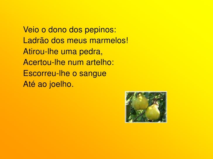77. 77. Veio o dono dos pepinos:<br />Ladrão dos meus marmelos!<br />Atirou-lhe uma pedra,<br />Acertou-lhe num artelho:<br />Escorreu-lhe o sangue<br />Até ao joelho.<br />