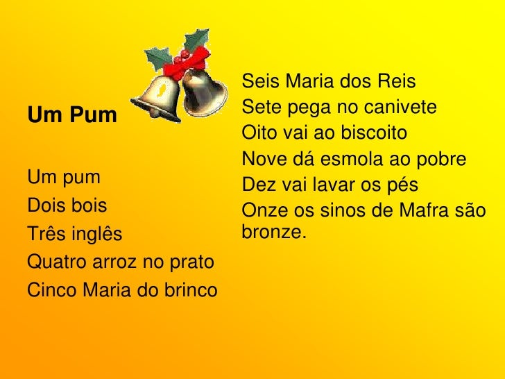 6. 6. Seis Maria dos Reis<br />Sete pega no canivete<br />Oito vai ao biscoito<br />Nove dá esmola ao pobre<br />Dez vai lavar os pés<br />Onze os sinos de Mafra são bronze.<br />Um Pum<br />Um pum<br />Dois bois<br />Três inglês<br />Quatro arroz no prato<br />Cinco Maria do brinco<br />