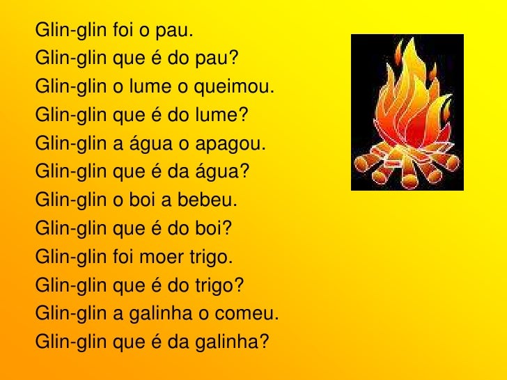 9. 9. Glin-glin foi o pau.<br />Glin-glin que é do pau?<br />Glin-glin o lume o queimou.<br />Glin-glin que é do lume?<br />Glin-glin a água o apagou.<br />Glin-glin que é da água?<br />Glin-glin o boi a bebeu.<br />Glin-glin que é do boi?<br />Glin-glin foi moer trigo.<br />Glin-glin que é do trigo?<br />Glin-glin a galinha o comeu.<br />Glin-glin que é da galinha?<br />