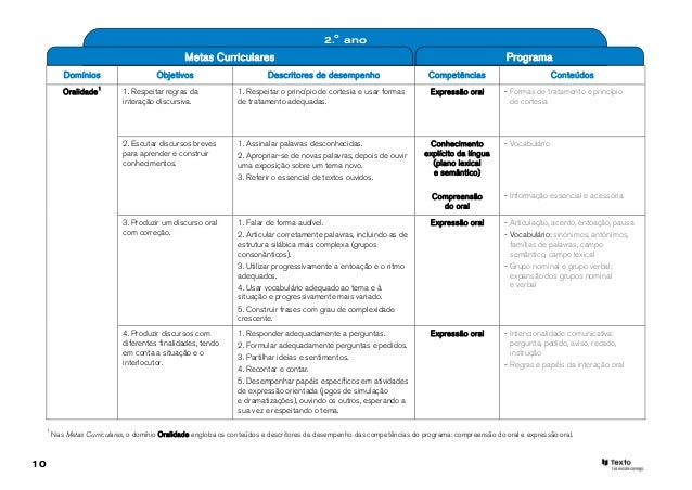 10. 10. 2.o ano Metas Curriculares Programa Domínios Objetivos Descritores de desempenho Competências Conteúdos Oralidade1 1. Respeitar regras da 1. Respeitar o princípio de cortesia e usar formas Expressão oral - Formas de tratamento e princípio interação discursiva. de tratamento adequadas. de cortesia 2. Escutar discursos breves 1. Assinalar palavras desconhecidas. Conhecimento - Vocabulário para aprender e construir 2. Apropriar-se de novas palavras, depois de ouvir explícito da língua conhecimentos. uma exposição sobre um tema novo. (plano lexical e semântico) 3. Referir o essencial de textos ouvidos. Compreensão - Informação essencial e acessória do oral 3. Produzir um discurso oral 1. Falar de forma audível. Expressão oral - Articulação, acento, entoação, pausa com correção. 2. Articular corretamente palavras, incluindo as de - Vocabulário: sinónimos, antónimos, estrutura silábica mais complexa (grupos famílias de palavras, campo consonânticos). semântico, campo lexical 3. Utilizar progressivamente a entoação e o ritmo - Grupo nominal e grupo verbal; adequados. expansão dos grupos nominal 4. Usar vocabulário adequado ao tema e à e verbal situação e progressivamente mais variado. 5. Construir frases com grau de complexidade crescente. 4. Produzir discursos com 1. Responder adequadamente a perguntas. Expressão oral - Intencionalidade comunicativa: diferentes finalidades, tendo 2. Formular adequadamente perguntas e pedidos. pergunta, pedido, aviso, recado, em conta a situação e o instrução 3. Partilhar ideias e sentimentos. interlocutor. - Regras e papéis da interação oral 4. Recontar e contar. 5. Desempenhar papéis específicos em atividades de expressão orientada (jogos de simulação e dramatizações), ouvindo os outros, esperando a sua vez e respeitando o tema. 1 Nas Metas Curriculares, o domínio Oralidade engloba os conteúdos e descritores de desempenho das competências do programa: compreensão do oral e expressão oral.10