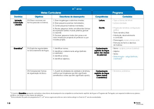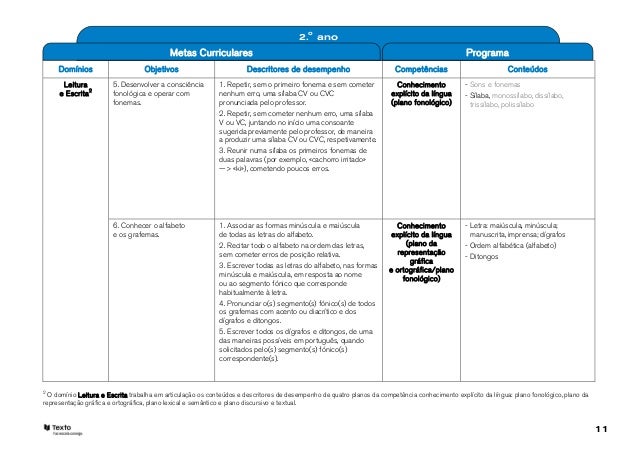 11. 11. 2.o ano Metas Curriculares Programa Domínios Objetivos Descritores de desempenho Competências Conteúdos Leitura 5. Desenvolver a consciência 1. Repetir, sem o primeiro fonema e sem cometer Conhecimento - Sons e fonemas e Escrita2 fonológica e operar com nenhum erro, uma sílaba CV ou CVC explícito da língua - Sílaba, monossílabo, dissílabo, fonemas. pronunciada pelo professor. (plano fonológico) trissílabo, polissílabo 2. Repetir, sem cometer nenhum erro, uma sílaba V ou VC, juntando no início uma consoante sugerida previamente pelo professor, de maneira a produzir uma sílaba CV ou CVC, respetivamente. 3. Reunir numa sílaba os primeiros fonemas de duas palavras (por exemplo, «cachorro irritado» —> «ki»), cometendo poucos erros. 6. Conhecer o alfabeto 1. Associar as formas minúscula e maiúscula Conhecimento - Letra: maiúscula, minúscula; e os grafemas. de todas as letras do alfabeto. explícito da língua manuscrita, imprensa; dígrafos 2. Recitar todo o alfabeto na ordem das letras, (plano da - Ordem alfabética (alfabeto) sem cometer erros de posição relativa. representação - Ditongos gráfica 3. Escrever todas as letras do alfabeto, nas formas e ortográfica/plano minúscula e maiúscula, em resposta ao nome fonológico) ou ao segmento fónico que corresponde habitualmente à letra. 4. Pronunciar o(s) segmento(s) fónico(s) de todos os grafemas com acento ou diacrítico e dos dígrafos e ditongos. 5. Escrever todos os dígrafos e ditongos, de uma das maneiras possíveis em português, quando solicitados pelo(s) segmento(s) fónico(s) correspondente(s).2 O domínio Leitura e Escrita trabalha em articulação os conteúdos e descritores de desempenho de quatro planos da competência conhecimento explícito da língua: plano fonológico, plano darepresentação gráfica e ortográfica, plano lexical e semântico e plano discursivo e textual. 11