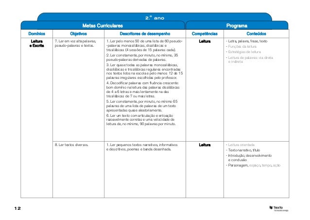 12. 12. 2.o ano Metas Curriculares Programa Domínios Objetivos Descritores de desempenho Competências Conteúdos Leitura 7. Ler em voz alta palavras, 1. Ler pelo menos 50 de uma lista de 60 pseudo- Leitura - Letra, palavra, frase, texto e Escrita pseudo-palavras e textos. -palavras monossilábicas, dissilábicas e - Funções da leitura trissilábicas (4 sessões de 15 palavras cada). - Estratégias de leitura 2. Ler corretamente, por minuto, no mínimo, 35 - Leitura de palavras: via direta pseudo-palavras derivadas de palavras. e indireta 3. Ler quase todas as palavras monossilábicas, dissilábicas e trissilábicas regulares encontradas nos textos lidos na escola e pelo menos 12 de 15 palavras irregulares escolhidas pelo professor. 4. Decodificar palavras com fluência crescente: bom domínio na leitura das palavras dissilábicas de 4 a 6 letras e mais lentamente na das trissilábicas de 7 ou mais letras. 5. Ler corretamente, por minuto, no mínimo 65 palavras de uma lista de palavras de um texto apresentadas quase aleatoriamente. 6. Ler um texto com articulação e entoação razoavelmente corretas e uma velocidade de leitura de, no mínimo, 90 palavras por minuto. 8. Ler textos diversos. 1. Ler pequenos textos narrativos, informativos Leitura - Leitura orientada e descritivos, poemas e banda desenhada. - Texto narrativo, título - Introdução, desenvolvimento e conclusão - Personagem, espaço, tempo, ação12
