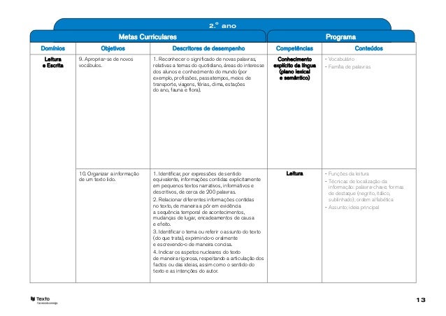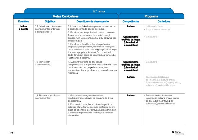 13. 13. 2.o ano Metas Curriculares ProgramaDomínios Objetivos Descritores de desempenho Competências Conteúdos Leitura 9. Apropriar-se de novos 1. Reconhecer o significado de novas palavras, Conhecimento - Vocabulárioe Escrita vocábulos. relativas a temas do quotidiano, áreas do interesse explícito da língua - Família de palavras dos alunos e conhecimento do mundo (por (plano lexical exemplo, profissões, passatempos, meios de e semântico) transporte, viagens, férias, clima, estações do ano, fauna e flora). 10. Organizar a informação 1. Identificar, por expressões de sentido Leitura - Funções da leitura de um texto lido. equivalente, informações contidas explicitamente - Técnicas de localização da em pequenos textos narrativos, informativos e informação: palavra-chave; formas descritivos, de cerca de 200 palavras. de destaque (negrito, itálico, 2. Relacionar diferentes informações contidas sublinhado); ordem alfabética no texto, de maneira a pôr em evidência - Assunto; ideia principal a sequência temporal de acontecimentos, mudanças de lugar, encadeamentos de causa e efeito. 3. Identificar o tema ou referir o assunto do texto (do que trata), exprimindo-o oralmente e escrevendo-o de maneira concisa. 4. Indicar os aspetos nucleares do texto de maneira rigorosa, respeitando a articulação dos factos ou das ideias, assim como o sentido do texto e as intenções do autor. 13