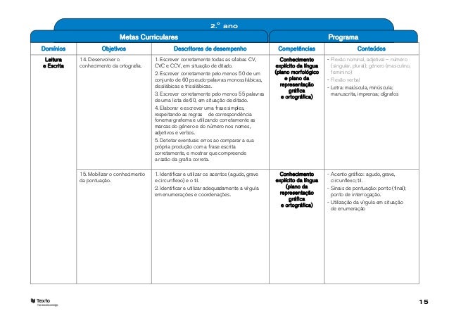 15. 15. 2.o ano Metas Curriculares ProgramaDomínios Objetivos Descritores de desempenho Competências Conteúdos Leitura 14. Desenvolver o 1. Escrever corretamente todas as sílabas CV, Conhecimento - Flexão nominal, adjetival – númeroe Escrita conhecimento da ortografia. CVC e CCV, em situação de ditado. explícito da língua (singular, plural); género (masculino, 2. Escrever corretamente pelo menos 50 de um (plano morfológico feminino) conjunto de 60 pseudo-palavras monossilábicas, e plano da - Flexão verbal dissilábicas e trissilábicas. representação - Letra: maiúscula, minúscula; gráfica 3. Escrever corretamente pelo menos 55 palavras manuscrita, imprensa; dígrafos e ortográfica) de uma lista de 60, em situação de ditado. 4. Elaborar e escrever uma frase simples, respeitando as regras de correspondência fonema-grafema e utilizando corretamente as marcas do género e do número nos nomes, adjetivos e verbos. 5. Detetar eventuais erros ao comparar a sua própria produção com a frase escrita corretamente, e mostrar que compreende a razão da grafia correta. 15. Mobilizar o conhecimento 1. Identificar e utilizar os acentos (agudo, grave Conhecimento - Acento gráfico: agudo, grave, da pontuação. e circunflexo) e o til. explícito da língua circunflexo; til. 2. Identificar e utilizar adequadamente a vírgula (plano da - Sinais de pontuação: ponto (final); em enumerações e coordenações. representação ponto de interrogação. gráfica - Utilização da vírgula em situação e ortográfica) de enumeração 15