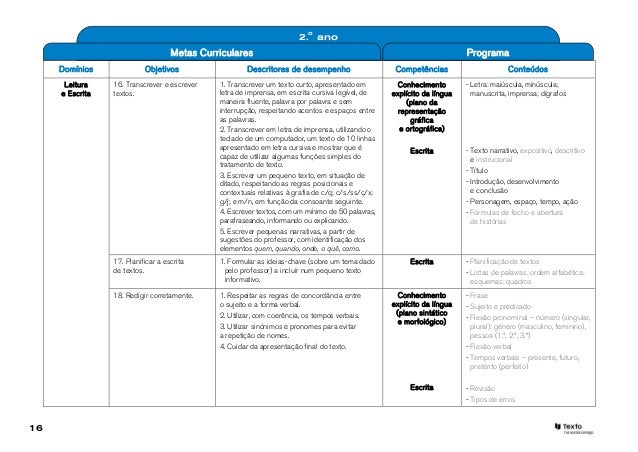 16. 16. 2.o ano Metas Curriculares Programa Domínios Objetivos Descritores de desempenho Competências Conteúdos Leitura 16. Transcrever e escrever 1. Transcrever um texto curto, apresentado em Conhecimento - Letra: maiúscula, minúscula; e Escrita textos. letra de imprensa, em escrita cursiva legível, de explícito da língua manuscrita, imprensa; dígrafos maneira fluente, palavra por palavra e sem (plano da interrupção, respeitando acentos e espaços entre representação as palavras. gráfica 2. Transcrever em letra de imprensa, utilizando o e ortográfica) teclado de um computador, um texto de 10 linhas apresentado em letra cursiva e mostrar que é Escrita - Texto narrativo, expositivo, descritivo capaz de utilizar algumas funções simples do e instrucional tratamento de texto. - Título 3. Escrever um pequeno texto, em situação de ditado, respeitando as regras posicionais e - Introdução, desenvolvimento contextuais relativas à grafia de c/q; c/s/ss/ç/x; e conclusão g/j; e m/n, em função da consoante seguinte. - Personagem, espaço, tempo, ação 4. Escrever textos, com um mínimo de 50 palavras, - Fórmulas de fecho e abertura parafraseando, informando ou explicando. de histórias 5. Escrever pequenas narrativas, a partir de sugestões do professor, com identificação dos elementos quem, quando, onde, o quê, como. 17. Planificar a escrita 1. Formular as ideias-chave (sobre um tema dado Escrita - Planificação de textos de textos. pelo professor) a incluir num pequeno texto - Listas de palavras; ordem alfabética; informativo. esquemas; quadros 18. Redigir corretamente. 1. Respeitar as regras de concordância entre Conhecimento - Frase o sujeito e a forma verbal. explícito da língua - Sujeito e predicado 2. Utilizar, com coerência, os tempos verbais. (plano sintático - Flexão pronominal – número (singular, e morfológico) 3. Utilizar sinónimos e pronomes para evitar plural); género (masculino, feminino), a repetição de nomes. pessoa (1.ª, 2.ª, 3.ª) 4. Cuidar da apresentação final do texto. - Flexão verbal - Tempos verbais – presente, futuro, pretérito (perfeito) Escrita - Revisão - Tipos de erros16