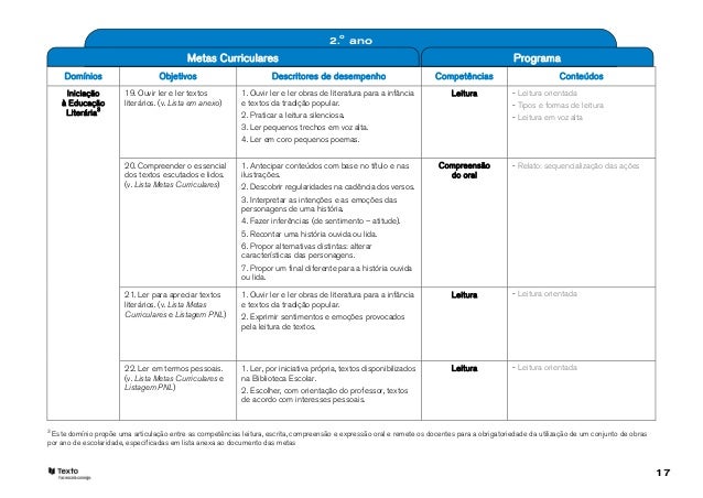 17. 17. 2.o ano Metas Curriculares Programa Domínios Objetivos Descritores de desempenho Competências Conteúdos Iniciação 19. Ouvir ler e ler textos 1. Ouvir ler e ler obras de literatura para a infância Leitura - Leitura orientada à Educação literários. (v. Lista em anexo) e textos da tradição popular. - Tipos e formas de leitura Literária3 2. Praticar a leitura silenciosa. - Leitura em voz alta 3. Ler pequenos trechos em voz alta. 4. Ler em coro pequenos poemas. 20. Compreender o essencial 1. Antecipar conteúdos com base no título e nas Compreensão - Relato: sequencialização das ações dos textos escutados e lidos. ilustrações. do oral (v. Lista Metas Curriculares) 2. Descobrir regularidades na cadência dos versos. 3. Interpretar as intenções e as emoções das personagens de uma história. 4. Fazer inferências (de sentimento – atitude). 5. Recontar uma história ouvida ou lida. 6. Propor alternativas distintas: alterar características das personagens. 7. Propor um final diferente para a história ouvida ou lida. 21. Ler para apreciar textos 1. Ouvir ler e ler obras de literatura para a infância Leitura - Leitura orientada literários. (v. Lista Metas e textos da tradição popular. Curriculares e Listagem PNL) 2. Exprimir sentimentos e emoções provocados pela leitura de textos. 22. Ler em termos pessoais. 1. Ler, por iniciativa própria, textos disponibilizados Leitura - Leitura orientada (v. Lista Metas Curriculares e na Biblioteca Escolar. Listagem PNL) 2. Escolher, com orientação do professor, textos de acordo com interesses pessoais.3 Este domínio propõe uma articulação entre as competências leitura, escrita, compreensão e expressão oral e remete os docentes para a obrigatoriedade da utilização de um conjunto de obraspor ano de escolaridade, especificadas em lista anexa ao documento das metas 17