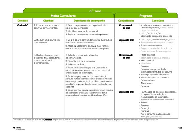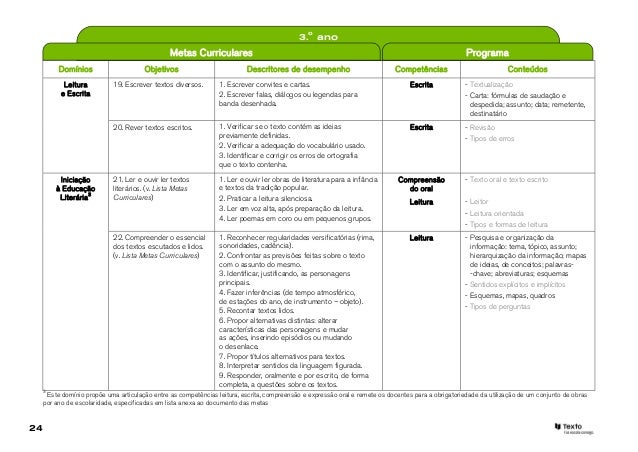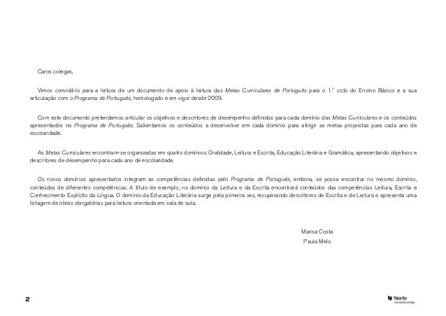 2. 2. Caros colegas, o Vimos convidá-lo para a leitura de um documento de apoio à leitura das Metas Curriculares de Português para o 1. ciclo do Ensino Básico e a sua articulação com o Programa de Português, homologado e em vigor desde 2009. Com este documento pretendemos articular os objetivos e descritores de desempenho definidos para cada domínio das Metas Curriculares e os conteúdos apresentados no Programa de Português. Salientamos os conteúdos a desenvolver em cada domínio para atingir as metas propostas para cada ano de escolaridade. As Metas Curriculares encontram-se organizadas em quatro domínios: Oralidade, Leitura e Escrita, Educação Literária e Gramática, apresentando objetivos e descritores de desempenho para cada ano de escolaridade. Os novos domínios apresentados integram as competências definidas pelo Programa de Português, embora, se possa encontrar no mesmo domínio, conteúdos de diferentes competências. A título de exemplo, no domínio da Leitura e da Escrita encontrará conteúdos das competências Leitura, Escrita e Conhecimento Explícito da Língua. O domínio da Educação Literária surge pela primeira vez, recuperando descritores de Escrita e de Leitura e apresenta uma listagem de obras obrigatórias para leitura orientada em sala de aula. Marisa Costa Paula Melo2