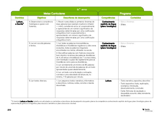 20. 20. 3.o ano Metas Curriculares Programa Domínios Objetivos Descritores de desempenho Competências Conteúdos Leitura 4. Desenvolver a consciência 1. Reunir numa sílaba os primeiros fonemas de Conhecimento - Sons e fonemas e Escrita2 fonológica e operar com duas palavras (por exemplo «cachorro irritado» explícito da língua - Sílaba fonemas. —>«ki»), cometendo erros só ocasionalmente (plano fonológico) e apresentando um número significativo de respostas determinadas por uma codificação ortográfica («si») ocasionalmente e apresentando um número significativo de respostas determinadas por uma codificação ortográfica («si»). 5. Ler em voz alta palavras 1. Ler todas as palavras monossilábicas, Conhecimento - Sons e fonemas e textos. dissilábicas e trissilábicas regulares e, salvo raras explícito da língua - Sílaba exceções, todas as palavras irregulares (plano fonológico) encontradas nos textos utilizados na escola. 2. Decodificar palavras com fluência crescente: bom domínio na leitura das palavras dissilábicas de 4 a 6 letras e trissilábicas de 7 ou mais letras, sem hesitação e quase tão rapidamente para as trissilábicas como para as dissilábicas. 3. Ler corretamente um mínimo de 80 palavras por minuto de uma lista de palavras de um texto apresentadas quase aleatoriamente. 4. Ler um texto com articulação e entoação corretas e uma velocidade de leitura de, no mínimo, 110 palavras por minuto. 6. Ler textos diversos. 1. Ler pequenos textos narrativos, informativos Leitura - Texto narrativo, expositivo, descritivo e descritivos, notícias, cartas, convites e banda - Texto expositivo: facto, explicação, desenhada. exemplos; introdução, desenvolvimento, conclusão - Carta: fórmulas de saudação e despedida; assunto; data; remetente, destinatário 2 O domínio Leitura e Escrita trabalha em articulação os conteúdos e descritores de desempenho de quatro planos da competência conhecimento explícito da língua: plano fonológico, plano da representação gráfica e ortográfica, plano lexical e semântico e plano discursivo e textual.20