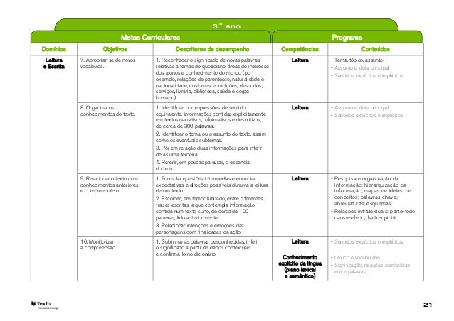21. 21. 3.o ano Metas Curriculares ProgramaDomínios Objetivos Descritores de desempenho Competências Conteúdos Leitura 7. Apropriar-se de novos 1. Reconhecer o significado de novas palavras, Leitura - Tema, tópico, assuntoe Escrita vocábulos. relativas a temas do quotidiano, áreas do interesse - Assunto e ideia principal dos alunos e conhecimento do mundo (por - Sentidos explícitos e implícitos exemplo, relações de parentesco, naturalidade e nacionalidade, costumes e tradições, desportos, serviços, livraria, biblioteca, saúde e corpo humano). 8. Organizar os 1. Identificar, por expressões de sentido Leitura - Assunto e ideia principal conhecimentos do texto. equivalente, informações contidas explicitamente - Sentidos explícitos e implícitos em textos narrativos, informativos e descritivos, de cerca de 300 palavras. 2. Identificar o tema ou o assunto do texto, assim como os eventuais subtemas. 3. Pôr em relação duas informações para inferir delas uma terceira. 4. Referir, em poucas palavras, o essencial do texto. 9. Relacionar o texto com 1. Formular questões intermédias e enunciar Leitura - Pesquisa e organização da conhecimentos anteriores expectativas e direções possíveis durante a leitura informação: hierarquização da e compreendê-lo. de um texto. informação; mapas de ideias, de 2. Escolher, em tempo limitado, entre diferentes conceitos; palavras-chave; frases escritas, a que contempla informação abreviaturas; esquemas contida num texto curto, de cerca de 100 - Relações intratextuais: parte-todo, palavras, lido anteriormente. causa-efeito, facto-opinião 3. Relacionar intenções e emoções das personagens com finalidades da ação. 10. Monitorizar 1. Sublinhar as palavras desconhecidas, inferir Leitura - Sentidos explícitos e implícitos a compreensão. o significado a partir de dados contextuais e confirmá-lo no dicionário. Conhecimento - Léxico e vocabulário explícito da língua - Significação; relações semânticas (plano lexical entre palavras e semântico) 21