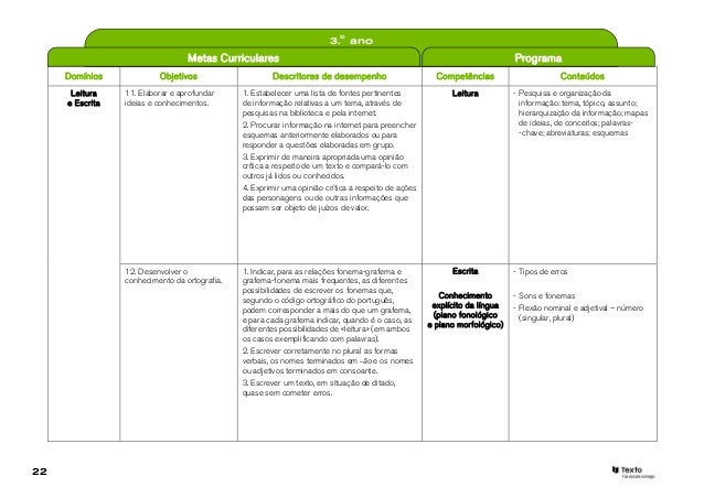 22. 22. 3.o ano Metas Curriculares Programa Domínios Objetivos Descritores de desempenho Competências Conteúdos Leitura 11. Elaborar e aprofundar 1. Estabelecer uma lista de fontes pertinentes Leitura - Pesquisa e organização da e Escrita ideias e conhecimentos. de informação relativas a um tema, através de informação: tema, tópico, assunto; pesquisas na biblioteca e pela internet. hierarquização da informação; mapas 2. Procurar informação na internet para preencher de ideias, de conceitos; palavras- esquemas anteriormente elaborados ou para -chave; abreviaturas; esquemas responder a questões elaboradas em grupo. 3. Exprimir de maneira apropriada uma opinião crítica a respeito de um texto e compará-lo com outros já lidos ou conhecidos. 4. Exprimir uma opinião crítica a respeito de ações das personagens ou de outras informações que possam ser objeto de juízos de valor. 12. Desenvolver o 1. Indicar, para as relações fonema-grafema e Escrita - Tipos de erros conhecimento da ortografia. grafema-fonema mais frequentes, as diferentes possibilidades de escrever os fonemas que, Conhecimento - Sons e fonemas segundo o código ortográfico do português, explícito da língua - Flexão nominal e adjetival – número podem corresponder a mais do que um grafema, (plano fonológico (singular, plural) e para cada grafema indicar, quando é o caso, as e plano morfológico) diferentes possibilidades de «leitura» (em ambos os casos exemplificando com palavras). 2. Escrever corretamente no plural as formas verbais, os nomes terminados em -ão e os nomes ou adjetivos terminados em consoante. 3. Escrever um texto, em situação de ditado, quase sem cometer erros.22