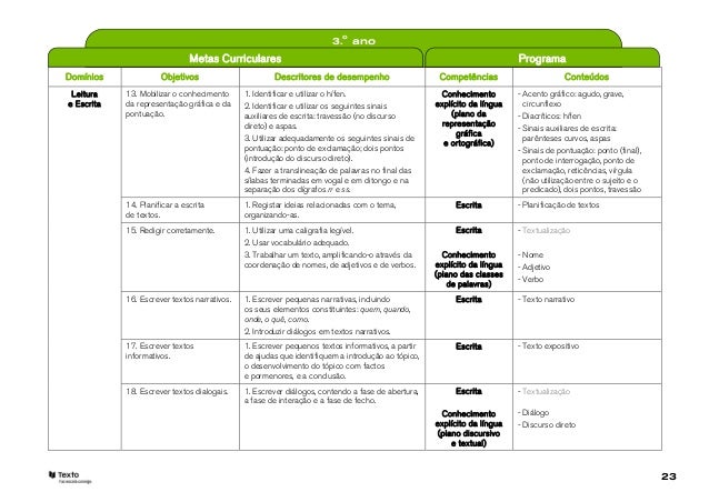 23. 23. 3.o ano Metas Curriculares ProgramaDomínios Objetivos Descritores de desempenho Competências Conteúdos Leitura 13. Mobilizar o conhecimento 1. Identificar e utilizar o hífen. Conhecimento - Acento gráfico: agudo, grave,e Escrita da representação gráfica e da 2. Identificar e utilizar os seguintes sinais explícito da língua circunflexo pontuação. auxiliares de escrita: travessão (no discurso (plano da - Diacríticos: hífen direto) e aspas. representação - Sinais auxiliares de escrita: gráfica 3. Utilizar adequadamente os seguintes sinais de parênteses curvos, aspas e ortográfica) pontuação: ponto de exclamação; dois pontos - Sinais de pontuação: ponto (final), (introdução do discurso direto). ponto de interrogação, ponto de 4. Fazer a translineação de palavras no final das exclamação, reticências, vírgula sílabas terminadas em vogal e em ditongo e na (não utilização entre o sujeito e o separação dos dígrafos rr e ss. predicado), dois pontos, travessão 14. Planificar a escrita 1. Registar ideias relacionadas com o tema, Escrita - Planificação de textos de textos. organizando-as. 15. Redigir corretamente. 1. Utilizar uma caligrafia legível. Escrita - Textualização 2. Usar vocabulário adequado. 3. Trabalhar um texto, amplificando-o através da Conhecimento - Nome coordenação de nomes, de adjetivos e de verbos. explícito da língua - Adjetivo (plano das classes - Verbo de palavras) 16. Escrever textos narrativos. 1. Escrever pequenas narrativas, incluindo Escrita - Texto narrativo os seus elementos constituintes: quem, quando, onde, o quê, como. 2. Introduzir diálogos em textos narrativos. 17. Escrever textos 1. Escrever pequenos textos informativos, a partir Escrita - Texto expositivo informativos. de ajudas que identifiquem a introdução ao tópico, o desenvolvimento do tópico com factos e pormenores, e a conclusão. 18. Escrever textos dialogais. 1. Escrever diálogos, contendo a fase de abertura, Escrita - Textualização a fase de interação e a fase de fecho. Conhecimento - Diálogo explícito da língua - Discurso direto (plano discursivo e textual) 23