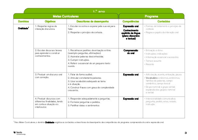 3. 3. 1.o ano Metas Curriculares Programa Domínios Objetivos Descritores de desempenho Competências Conteúdos 1. Respeitar regras da 1. Escutar os outros e esperar pela sua vez para Expressão oral - Formas de tratamento e princípio de Oralidade1 interação discursiva. falar. cortesia Conhecimento 2. Respeitar o princípio de cortesia. explícito da língua - Regras e papéis da interação oral (plano discursivo e textual) 2. Escutar discursos breves 1. Reconhecer padrões de entoação e ritmo Compreensão - Entoação e ritmo para aprender e construir (exemplo: perguntas, afirmações). do oral - Instruções; indicações conhecimentos. 2. Assinalar palavras desconhecidas. - Informação essencial e acessória 3. Cumprir instruções. - Tema e assunto 4. Referir o essencial de um pequeno texto - Reconto ouvido. 3. Produzir um discurso oral 1. Falar de forma audível. Expressão oral - Articulação, acento, entoação, pausa com correção. 2. Articular corretamente palavras. - Vocabulário: sinónimos, antónimos, 3. Usar vocabulário adequado ao tema famílias de palavras, campo e à situação. semântico, campo lexical 4. Construir frases com graus de complexidade - Grupo nominal e grupo verbal; crescente. expansão dos grupos nominal e verbal 4. Produzir discursos com 1. Responder adequadamente a perguntas. Expressão oral - Intencionalidade comunicativa: diferentes finalidades, tendo 2. Formular perguntas e pedidos. pergunta, pedido, aviso, recado, em conta a situação e o instrução 3. Partilhar ideias e sentimentos interlocutor.1 Nas Metas Curriculares, o domínio Oralidade engloba os conteúdos e descritores de desempenho das competências do programa: compreensão do oral e expressão oral. 3