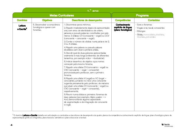 4. 4. 1.o ano Metas Curriculares Programa Domínios Objetivos Descritores de desempenho Competências Conteúdos Leitura 5. Desenvolver a consciência 1. Discriminar pares mínimos. Conhecimento - Sons e fonemas fonológica e operar com 2. Repetir imediatamente depois da apresentação explícito da língua - Vogais oral, nasal; consoantes e Escrita2 fonemas. (plano fonológico) oral, sem erros de identidade ou de ordem, - Ditongos palavras e pseudo-palavras constituídas por pelo - Sílaba, monossílabo, dissílabo, menos 3 sílabas: CV (consoante – vogal) ou CCV trissílabo, polissílabo (consoante – consoante – vogal). 3. Contar o número de sílabas numa palavra de 2, 3 ou 4 sílabas. 4. Repetir uma palavra ou pseudo-palavra dissilábica sem dizer a primeira sílaba. 5. Decidir qual de duas palavras apresentadas oralmente é mais longa (referentes de diferentes tamanhos, por exemplo «cão« – «borboleta»). 6. Indicar desenhos de objetos cujos nomes começam pelo mesmo fonema. 7. Repetir uma sílaba CV (consoante – vogal) ou CVC (consoante – vogal – consoante) pronunciada pelo professor, sem o primeiro fonema. 8. Repetir uma sílaba V (vogal) ou VC (vogal – consoante), juntando no início uma consoante sugerida previamente pelo professor, de maneira a produzir uma sílaba CV (consoante – vogal) ou CVC (consoante – vogal – consoante), respetivamente. 9. Reunir numa sílaba os primeiros fonemas de duas palavras (por exemplo, «lápis usado» —> «lu»), demonstrando alguma capacidade de segmentação e de integração de consoante e vogal. 2 O domínio Leitura e Escrita trabalha em articulação os conteúdos e descritores de desempenho de quatro planos da competência conhecimento explícito da língua: plano fonológico, plano da representação gráfica e ortográfica, plano lexical e semântico e plano discursivo e textual.4