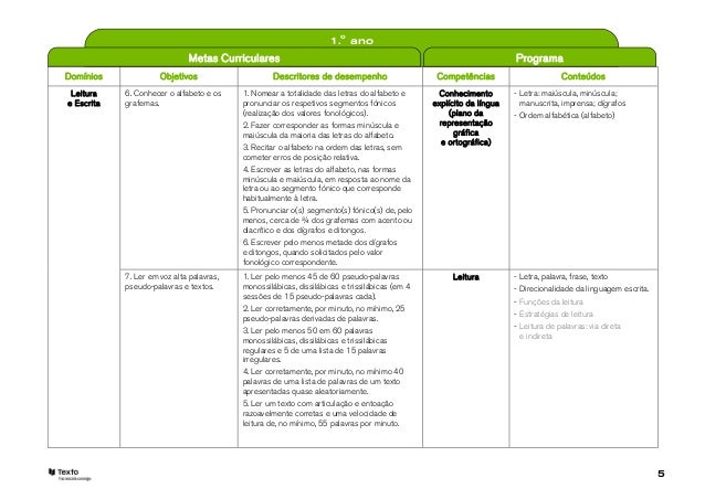 5. 5. 1.o ano Metas Curriculares ProgramaDomínios Objetivos Descritores de desempenho Competências Conteúdos Leitura 6. Conhecer o alfabeto e os 1. Nomear a totalidade das letras do alfabeto e Conhecimento - Letra: maiúscula, minúscula;e Escrita grafemas. pronunciar os respetivos segmentos fónicos explícito da língua manuscrita, imprensa; dígrafos (realização dos valores fonológicos). (plano da - Ordem alfabética (alfabeto) 2. Fazer corresponder as formas minúscula e representação maiúscula da maioria das letras do alfabeto. gráfica e ortográfica) 3. Recitar o alfabeto na ordem das letras, sem cometer erros de posição relativa. 4. Escrever as letras do alfabeto, nas formas minúscula e maiúscula, em resposta ao nome da letra ou ao segmento fónico que corresponde habitualmente à letra. 5. Pronunciar o(s) segmento(s) fónico(s) de, pelo menos, cerca de ¾ dos grafemas com acento ou diacrítico e dos dígrafos e ditongos. 6. Escrever pelo menos metade dos dígrafos e ditongos, quando solicitados pelo valor fonológico correspondente. 7. Ler em voz alta palavras, 1. Ler pelo menos 45 de 60 pseudo-palavras Leitura - Letra, palavra, frase, texto pseudo-palavras e textos. monossilábicas, dissilábicas e trissilábicas (em 4 - Direcionalidade da linguagem escrita. sessões de 15 pseudo-palavras cada). - Funções da leitura 2. Ler corretamente, por minuto, no mínimo, 25 - Estratégias de leitura pseudo-palavras derivadas de palavras. - Leitura de palavras: via direta 3. Ler pelo menos 50 em 60 palavras e indireta monossilábicas, dissilábicas e trissilábicas regulares e 5 de uma lista de 15 palavras irregulares. 4. Ler corretamente, por minuto, no mínimo 40 palavras de uma lista de palavras de um texto apresentadas quase aleatoriamente. 5. Ler um texto com articulação e entoação razoavelmente corretas e uma velocidade de leitura de, no mínimo, 55 palavras por minuto. 5
