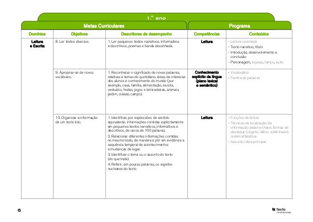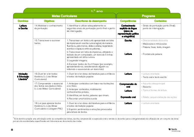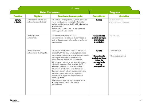 7. 7. 1.o ano Metas Curriculares ProgramaDomínios Objetivos Descritores de desempenho Competências Conteúdos Leitura 11. Relacionar o texto com 1. Escolher, em tempo limitado, entre diferentes Leitura - Leitura orientadae Escrita conhecimentos anteriores. frases escritas, a que contempla informação - Tipos e formas de leitura contida num texto curto, de 30 a 50 palavras, lido anteriormente. 2. Interpretar as intenções e as emoções das personagens de uma história. 12. Monitorizar a 1. Sublinhar no texto as frases não Conhecimento - Vocabulário compreensão. compreendidas e as palavras desconhecidas e explícito da língua pedir esclarecimento e informação ao professor (plano lexical e aos colegas. e semântico) 13. Desenvolver o 1. Escrever corretamente a grande maioria das Escrita - Tipos de erros conhecimento da ortografia. sílabas CV, CVC e CCV, em situação de ditado. 2. Escrever corretamente mais de metade de uma Conhecimento - Configuração gráfica lista de pelo menos 60 pseudo-palavras explícito da língua monossilábicas, dissilábicas e trissilábicas. (plano da 3. Escrever corretamente cerca de 45 de uma representação lista de 60 palavras e 5 de uma lista de 15 gráfica palavras irregulares, em situação de ditado. e ortográfica) 4. Escrever corretamente os grafemas que dependem do contexto em que se encontram. 5. Elaborar e escrever uma frase simples, respeitando as regras de correspondência fonema-grafema. 6. Detetar eventuais erros ao comparar a sua própria produção com a frase escrita corretamente. 7