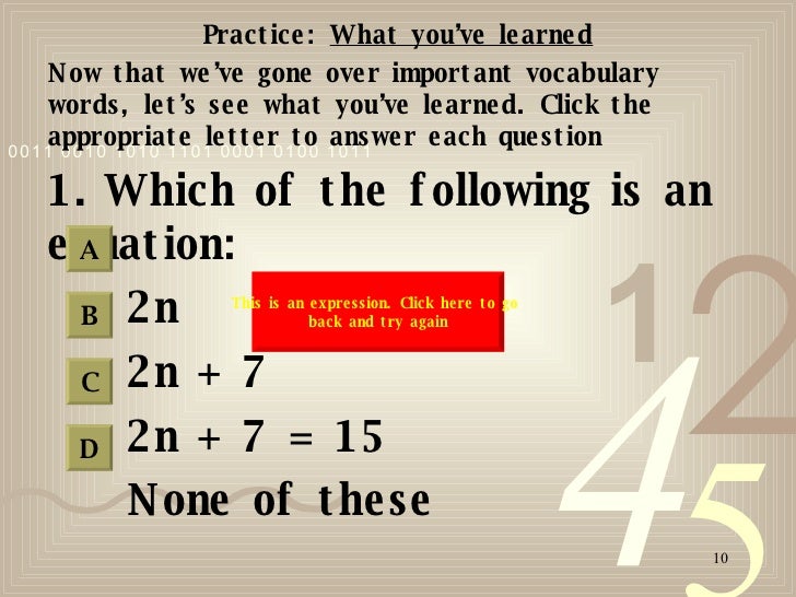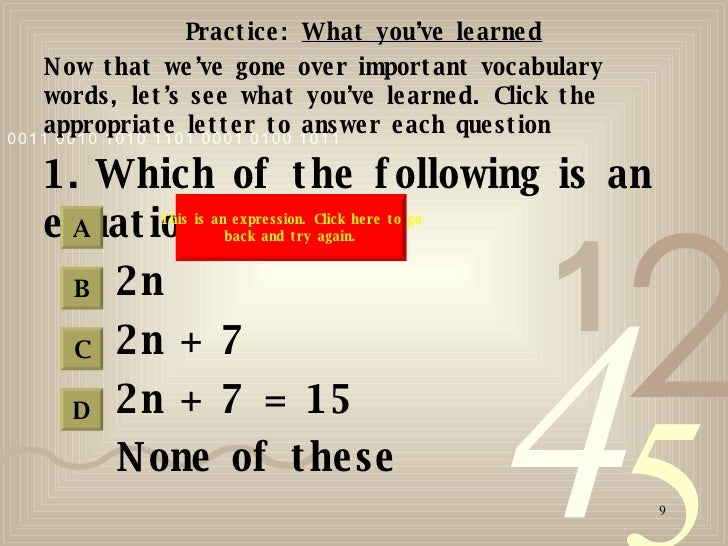 10. 10. <ul><li>Practice: What you’ve learned </li></ul><ul><li>Now that we’ve gone over important vocabulary words, let’s see what you’ve learned. Click the appropriate letter to answer each question </li></ul><ul><li>1. Which of the following is an equation: </li></ul><ul><li>2n </li></ul><ul><li>2n + 7 </li></ul><ul><li>2n + 7 = 15 </li></ul><ul><li>None of these </li></ul>A B D C This is an expression. Click here to go back and try again