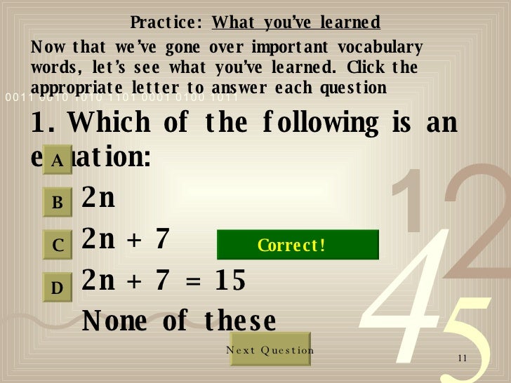 11. 11. <ul><li>Practice: What you’ve learned </li></ul><ul><li>Now that we’ve gone over important vocabulary words, let’s see what you’ve learned. Click the appropriate letter to answer each question </li></ul><ul><li>1. Which of the following is an equation: </li></ul><ul><li>2n </li></ul><ul><li>2n + 7 </li></ul><ul><li>2n + 7 = 15 </li></ul><ul><li>None of these </li></ul>A B D C Correct! Next Question