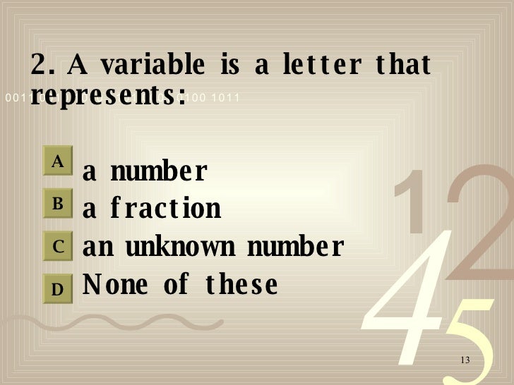 13. 13. <ul><li>2. A variable is a letter that represents: </li></ul><ul><li>a number </li></ul><ul><li>a fraction </li></ul><ul><li>an unknown number </li></ul><ul><li>None of these </li></ul>A B D C