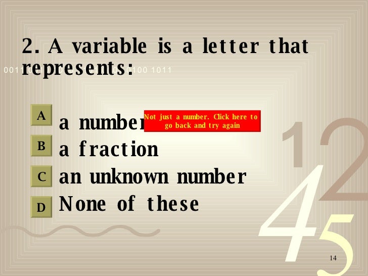 14. 14. <ul><li>2. A variable is a letter that represents: </li></ul><ul><li>a number </li></ul><ul><li>a fraction </li></ul><ul><li>an unknown number </li></ul><ul><li>None of these </li></ul>A B D C Not just a number. Click here to go back and try again