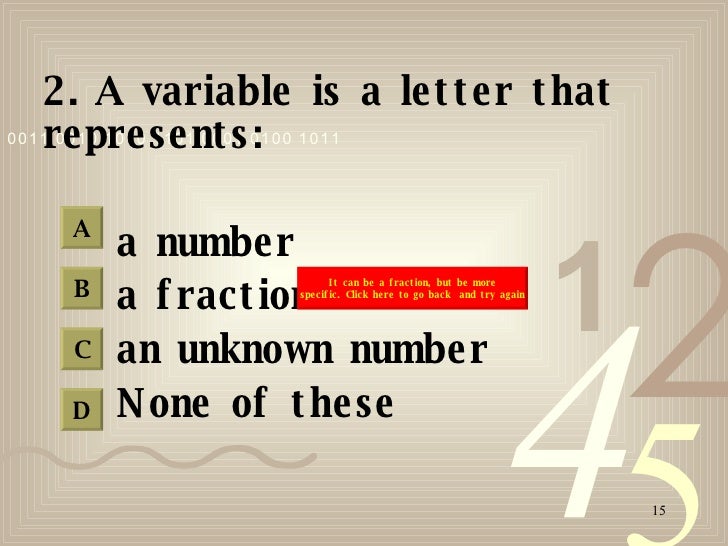 15. 15. <ul><li>2. A variable is a letter that represents: </li></ul><ul><li>a number </li></ul><ul><li>a fraction </li></ul><ul><li>an unknown number </li></ul><ul><li>None of these </li></ul>A B D C It can be a fraction, but be more specific. Click here to go back and try again