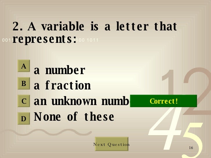 16. 16. <ul><li>2. A variable is a letter that represents: </li></ul><ul><li>a number </li></ul><ul><li>a fraction </li></ul><ul><li>an unknown number </li></ul><ul><li>None of these </li></ul>A B D C Correct! Next Question