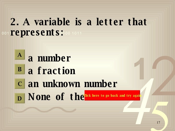 17. 17. <ul><li>2. A variable is a letter that represents: </li></ul><ul><li>a number </li></ul><ul><li>a fraction </li></ul><ul><li>an unknown number </li></ul><ul><li>None of these </li></ul>A B D C Click here to go back and try again