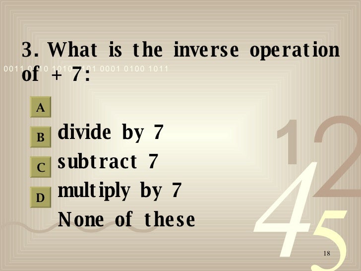 18. 18. <ul><li>3. What is the inverse operation of + 7: </li></ul><ul><li>divide by 7 </li></ul><ul><li>subtract 7 </li></ul><ul><li>multiply by 7 </li></ul><ul><li>None of these </li></ul>A B D C