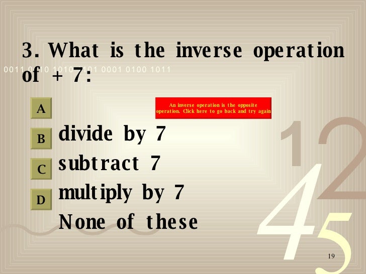 19. 19. <ul><li>3. What is the inverse operation of + 7: </li></ul><ul><li>divide by 7 </li></ul><ul><li>subtract 7 </li></ul><ul><li>multiply by 7 </li></ul><ul><li>None of these </li></ul>A B D C An inverse operation is the opposite operation. Click here to go back and try again