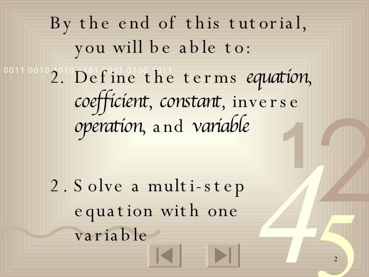 2. 2. <ul><li>By the end of this tutorial, you will be able to: </li></ul><ul><li>Define the terms equation , coefficient , constant , inverse operation , and variable </li></ul><ul><li>2. Solve a multi-step equation with one variable </li></ul>
