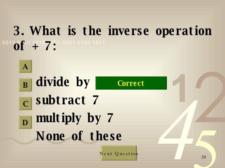 20. 20. <ul><li>3. What is the inverse operation of + 7: </li></ul><ul><li>divide by 7 </li></ul><ul><li>subtract 7 </li></ul><ul><li>multiply by 7 </li></ul><ul><li>None of these </li></ul>A B D C Correct Next Question