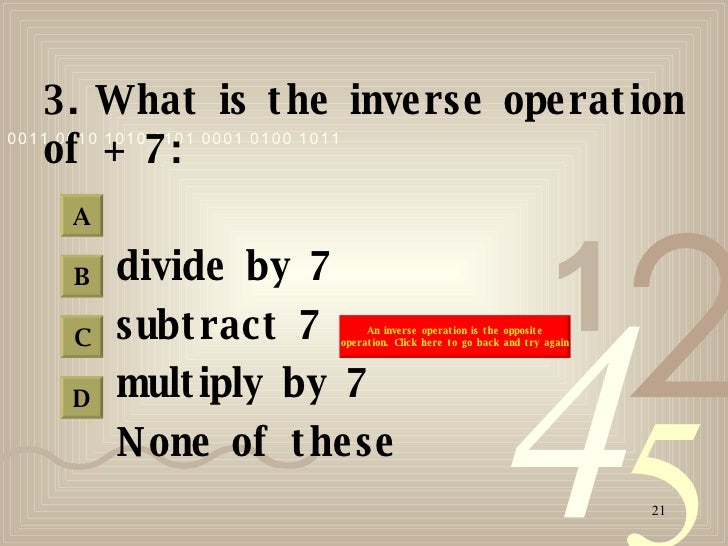 21. 21. <ul><li>3. What is the inverse operation of + 7: </li></ul><ul><li>divide by 7 </li></ul><ul><li>subtract 7 </li></ul><ul><li>multiply by 7 </li></ul><ul><li>None of these </li></ul>A B D C An inverse operation is the opposite operation. Click here to go back and try again