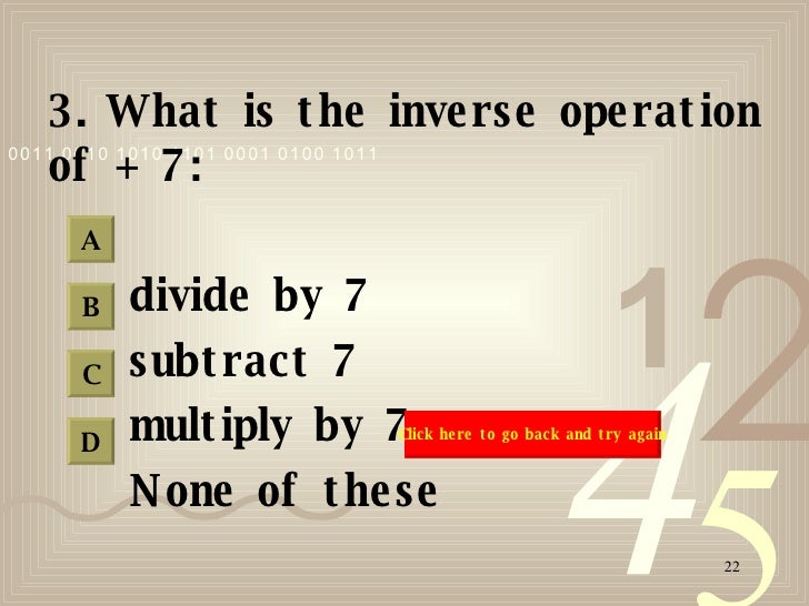 22. 22. <ul><li>3. What is the inverse operation of + 7: </li></ul><ul><li>divide by 7 </li></ul><ul><li>subtract 7 </li></ul><ul><li>multiply by 7 </li></ul><ul><li>None of these </li></ul>A B D C Click here to go back and try again