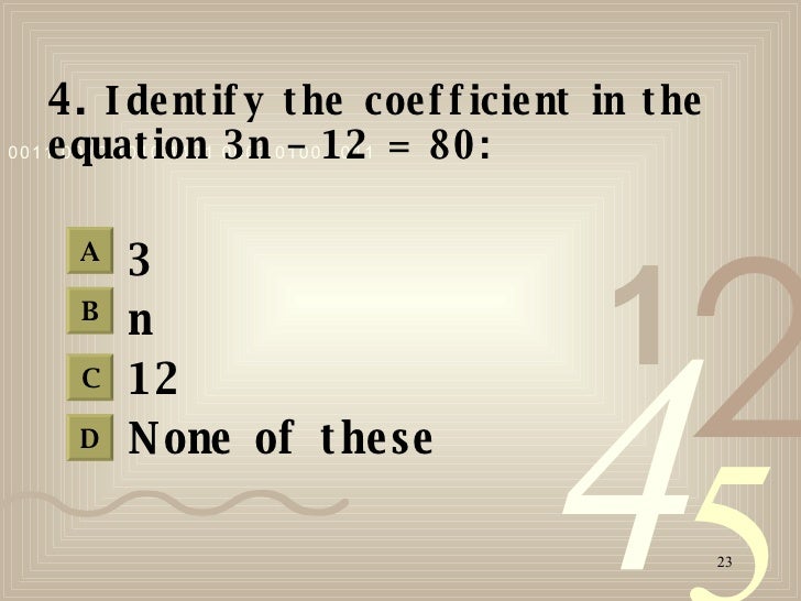 23. 23. <ul><li>4. Identify the coefficient in the equation 3n – 12 = 80: </li></ul><ul><li>3 </li></ul><ul><li>n </li></ul><ul><li>12 </li></ul><ul><li>None of these </li></ul>A B D C