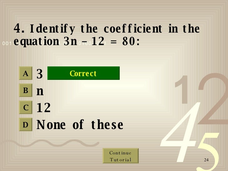 24. 24. <ul><li>4. Identify the coefficient in the equation 3n – 12 = 80: </li></ul><ul><li>3 </li></ul><ul><li>n </li></ul><ul><li>12 </li></ul><ul><li>None of these </li></ul>A B D C Correct Continue Tutorial