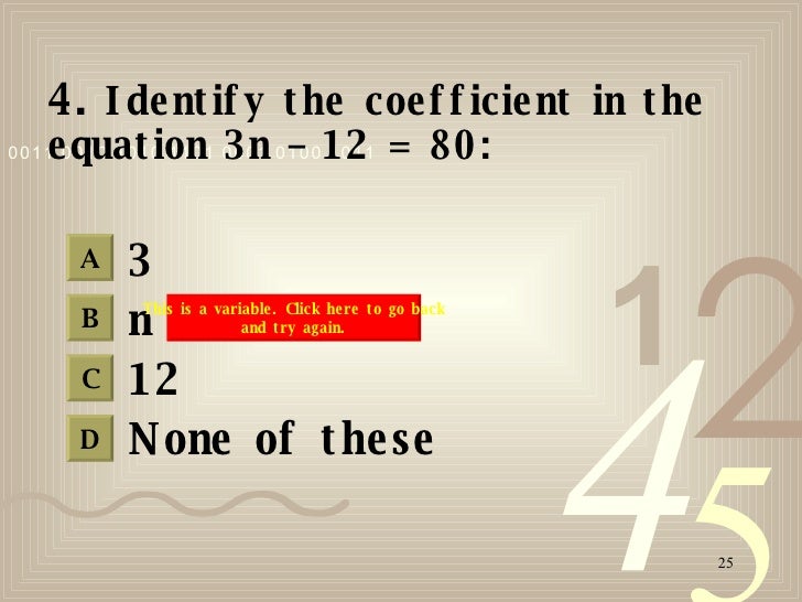 25. 25. <ul><li>4. Identify the coefficient in the equation 3n – 12 = 80: </li></ul><ul><li>3 </li></ul><ul><li>n </li></ul><ul><li>12 </li></ul><ul><li>None of these </li></ul>A B D C This is a variable. Click here to go back and try again.