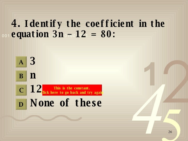 26. 26. <ul><li>4. Identify the coefficient in the equation 3n – 12 = 80: </li></ul><ul><li>3 </li></ul><ul><li>n </li></ul><ul><li>12 </li></ul><ul><li>None of these </li></ul>A B D C This is the constant. Click here to go back and try again