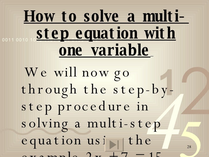 28. 28. <ul><li>How to solve a multi-step equation with one variable </li></ul><ul><li>We will now go through the step-by-step procedure in solving a multi-step equation using the example 2x + 7 = 15 </li></ul>