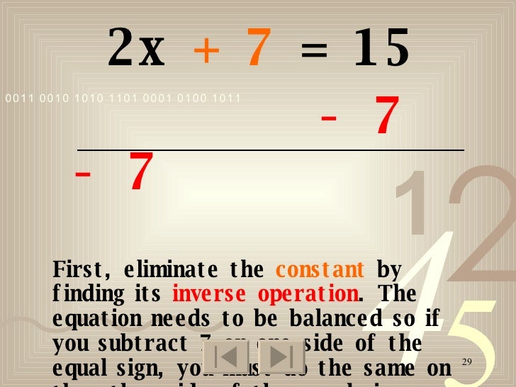 29. 29. <ul><li>2x + 7 = 15 </li></ul><ul><li>- 7 - 7 </li></ul><ul><li>First, eliminate the constant by finding its inverse operation . The equation needs to be balanced so if you subtract 7 on one side of the equal sign, you must do the same on the other side of the equal sign. </li></ul>