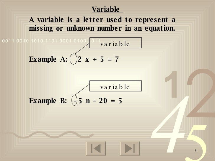 3. 3. <ul><li>Variable </li></ul><ul><li>A variable is a letter used to represent a missing or unknown number in an equation. </li></ul><ul><li>Example A: 2 x + 5 = 7 </li></ul><ul><li>Example B: -5 n – 20 = 5 </li></ul>variable variable