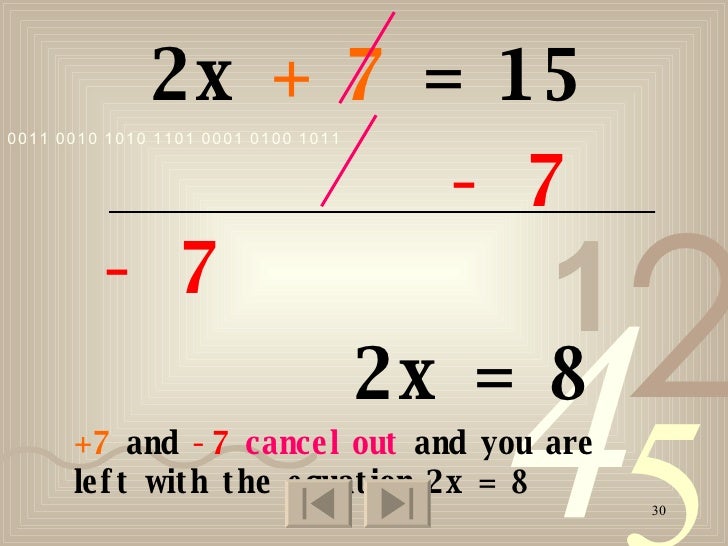 30. 30. <ul><li>2x + 7 = 15 </li></ul><ul><li>- 7 - 7 </li></ul><ul><li> 2x = 8 </li></ul><ul><li>+7 and -7 cancel out and you are left with the equation 2x = 8 </li></ul>
