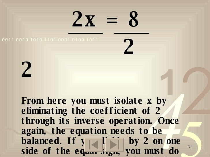 31. 31. <ul><li>2x = 8 </li></ul><ul><li>2 2 </li></ul><ul><li>From here you must isolate x by eliminating the coefficient of 2 through its inverse operation. Once again, the equation needs to be balanced. If you divide by 2 on one side of the equal sign, you must do the same on the other side of the equal sign. </li></ul>