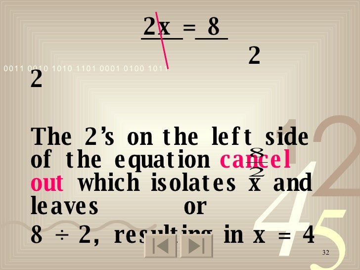 32. 32. <ul><li>2x = 8 </li></ul><ul><li>2 2 </li></ul><ul><li>The 2’s on the left side of the equation cancel out which isolates x and leaves or </li></ul><ul><li>8 ÷ 2, resulting in x = 4 </li></ul><ul><li>. </li></ul>