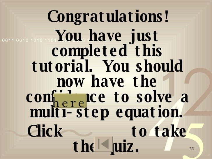 33. 33. <ul><li>Congratulations! </li></ul><ul><li>You have just completed this tutorial. You should now have the confidence to solve a multi-step equation. </li></ul><ul><li>Click to take the quiz. </li></ul>here