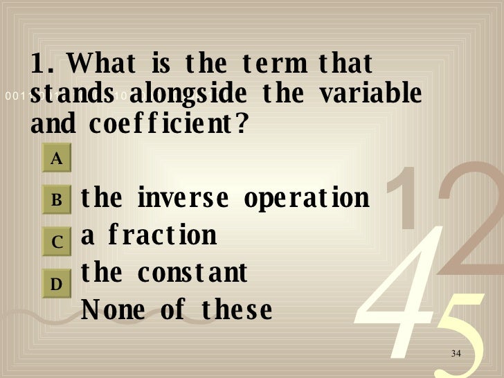 34. 34. <ul><li>1. What is the term that stands alongside the variable and coefficient? </li></ul><ul><li>the inverse operation </li></ul><ul><li>a fraction </li></ul><ul><li>the constant </li></ul><ul><li>None of these </li></ul>A B D C