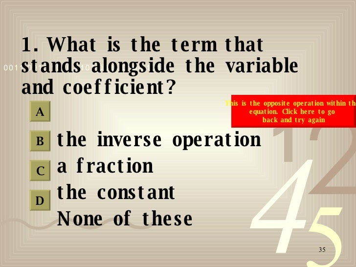 35. 35. <ul><li>1. What is the term that stands alongside the variable and coefficient? </li></ul><ul><li>the inverse operation </li></ul><ul><li>a fraction </li></ul><ul><li>the constant </li></ul><ul><li>None of these </li></ul>A B D C This is the opposite operation within the equation. Click here to go back and try again