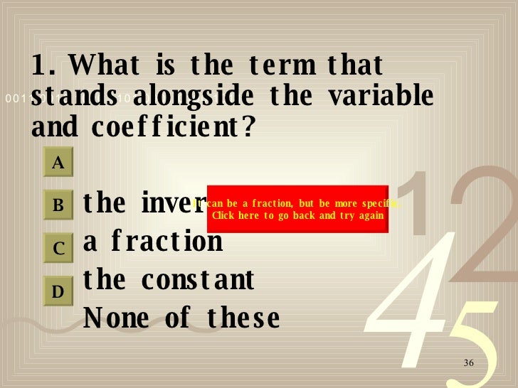 36. 36. <ul><li>1. What is the term that stands alongside the variable and coefficient? </li></ul><ul><li>the inverse operation </li></ul><ul><li>a fraction </li></ul><ul><li>the constant </li></ul><ul><li>None of these </li></ul>A B D C It can be a fraction, but be more specific. Click here to go back and try again